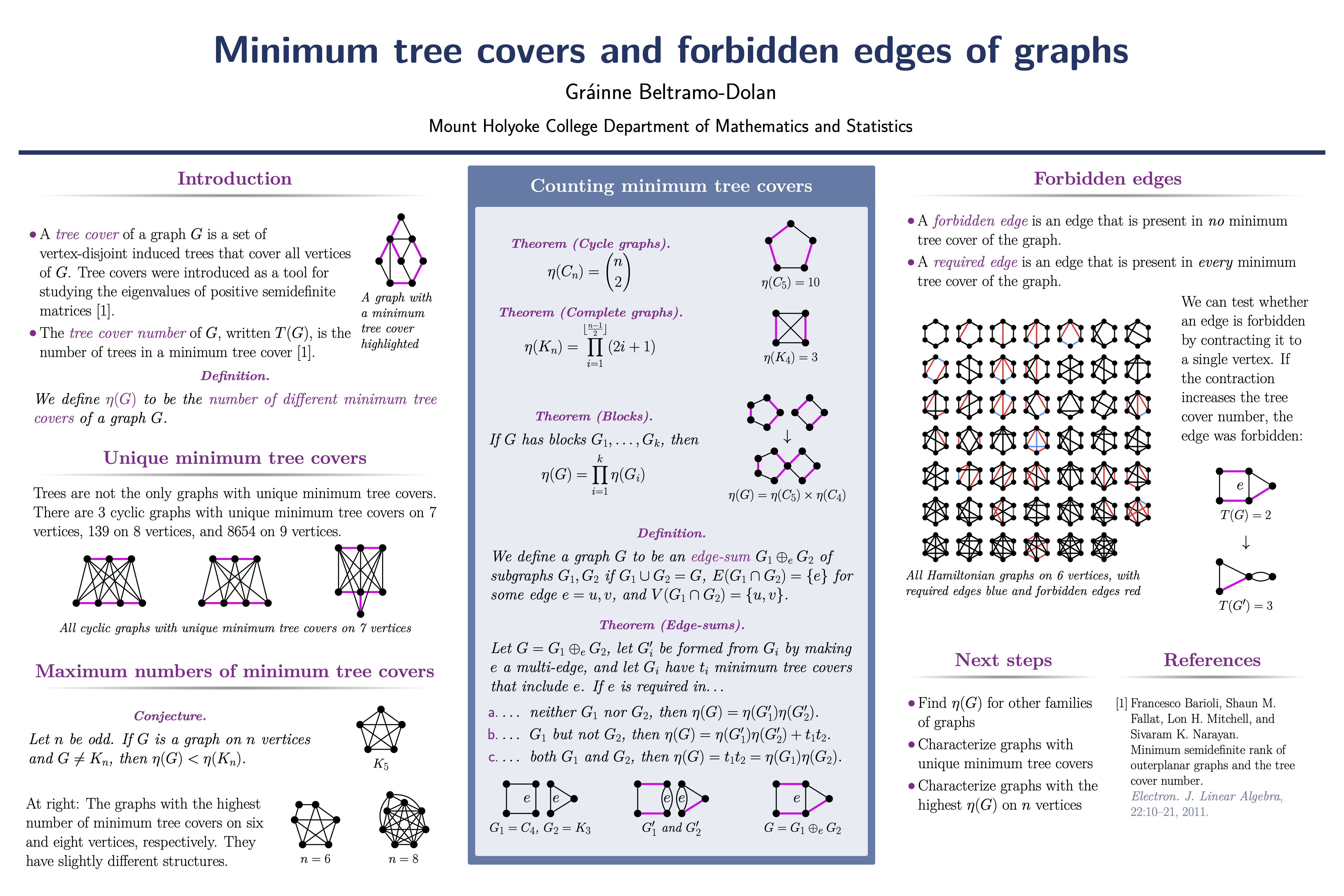 In this graph theory project, I worked with Mount Holyoke College professor Chassidy Bozeman to study minimum tree covers of graphs. Minimum tree covers were only introduced in 2011 and have not yet been thoroughly studied. We found formulas to calculate the number of minimum tree covers of certain families of graphs, and we investigated "forbidden" edges which are never present in a minimum tree cover of a graph.